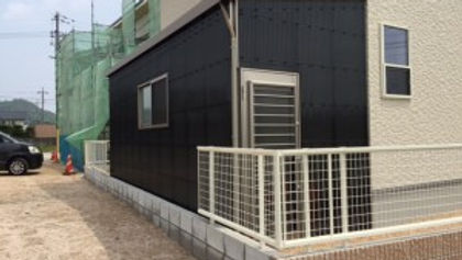 さしかけにステン色のアルミの柱を使用したことで、黒い波板のさしかけですが、建物との一体感が生まれ、違和感なく仕上がっています。